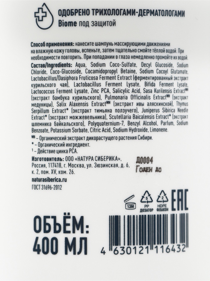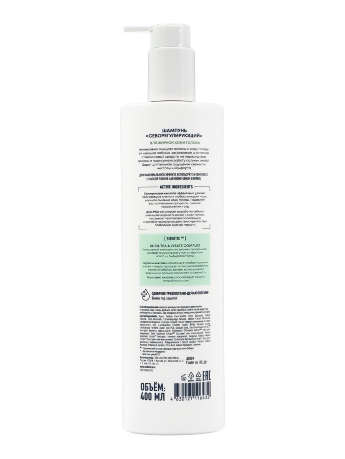 Шампунь себорегулирующий NS Lab Biome SEBUM CONTROL для жирной кожи головы, 400 мл