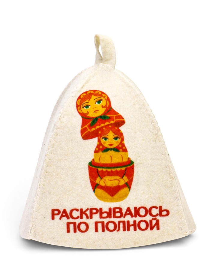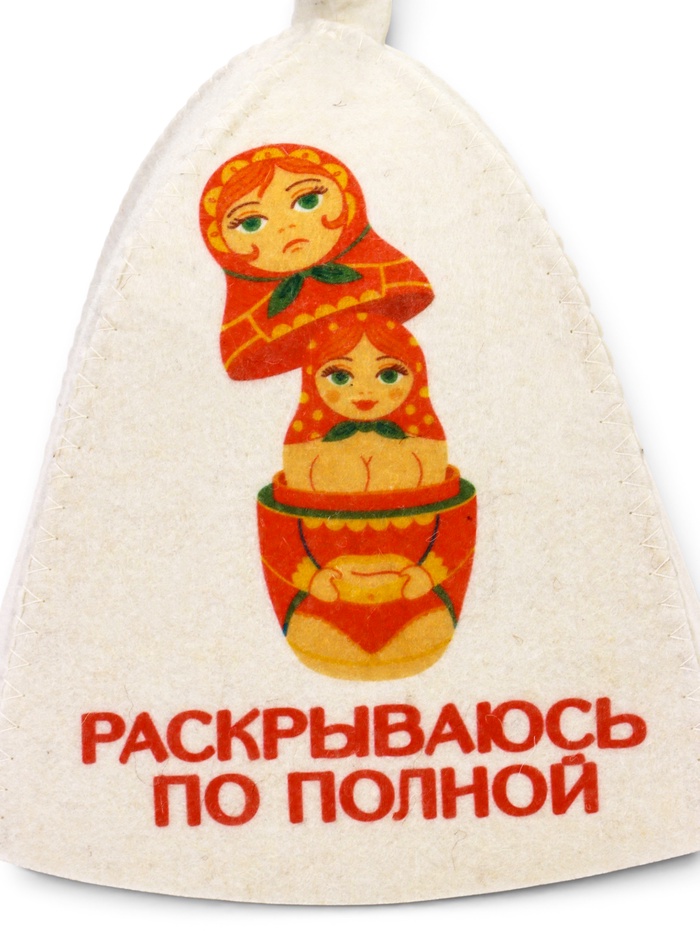 Банная шапка с принтом «Раскрываюсь по полной» — аксессуар для бани и сауны с образным и легко читаемым сюжетом. Рисунок с матрёшкой, раскрывающейся слой за слоем настраивает на глубокий отдых.