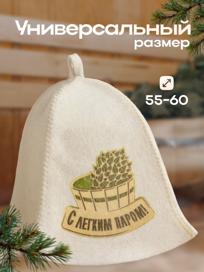 Шапка для бани и сауны с принтом «С лёгким паром» от «Добропаровъ». Универсальный аксессуар из 70% полиэфира и 30% шерсти, созданный для тех, кто ценит комфорт и качество. Универсальный размер (55-60) подойдёт большинству пользователей. Светлый оттенок подойдет и мужчинам, и женщинам. Идеальный выбор для создания атмосферы расслабления и уюта в бане или сауне.