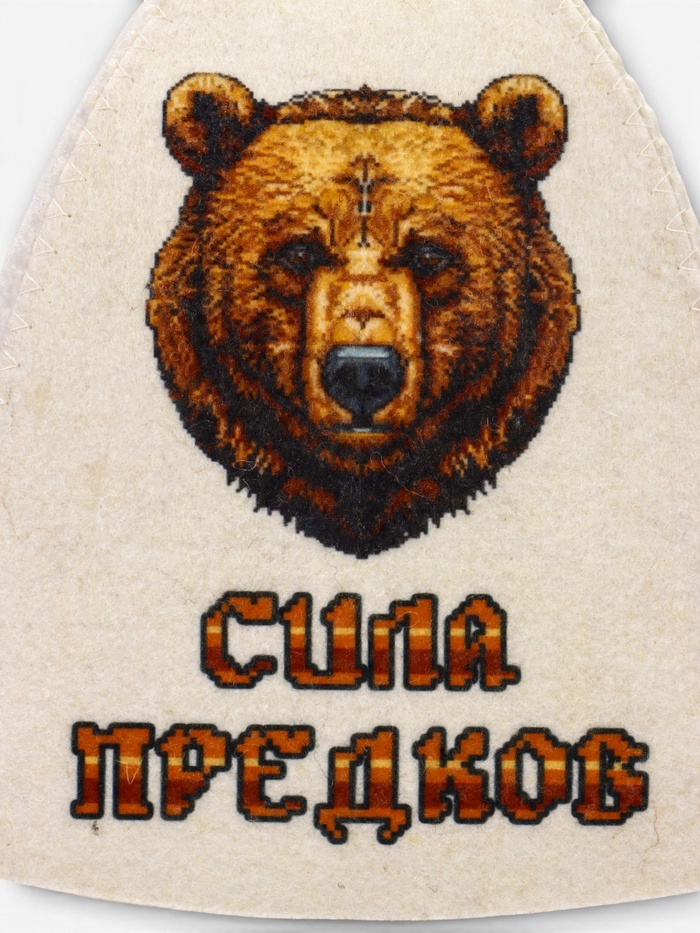 Банная шапка с принтом «Сила предков» — аксессуар для бани и сауны с выразительным образом и прямым смысловым посылом. Изображение медведя воспринимается как символ устойчивости и внутреннего зверя, что органично сочетается с банным ритуалом.