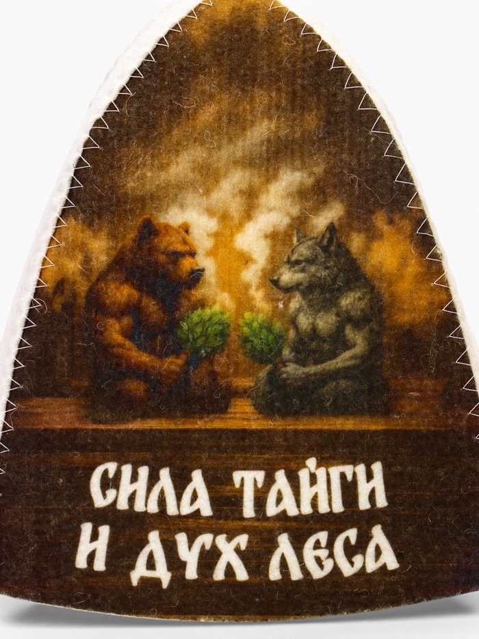 Банная шапка с таёжным сюжетом — практичный аксессуар для бани и сауны, оформленный в духе северных мотивов. Сцена с медведем и волком у костра создаёт цельный образ спокойной силы и уединения, близкий атмосфере парной.