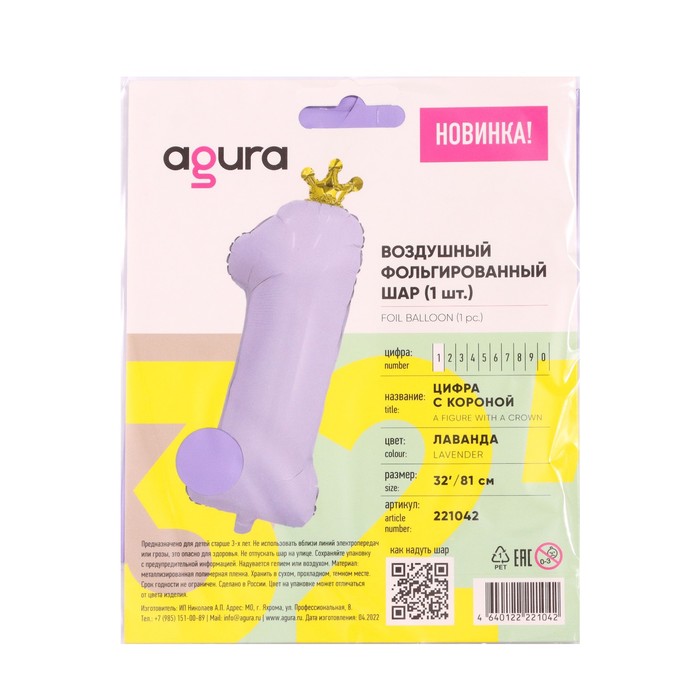 Шар фольгированный 32" «Цифра 1», мистик лаванда, индивидуальная упаковка