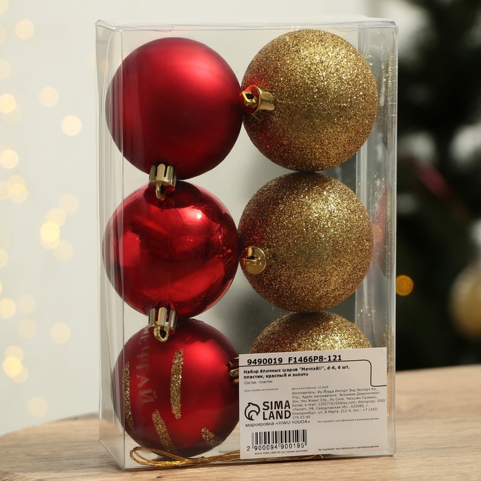 Шары ёлочные новогодние «Мечтай!!», пластик, d=6, 6 шт., красный, золотой