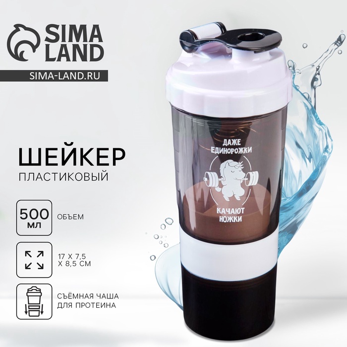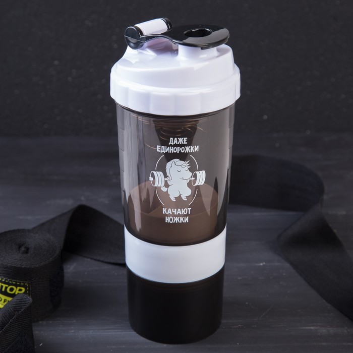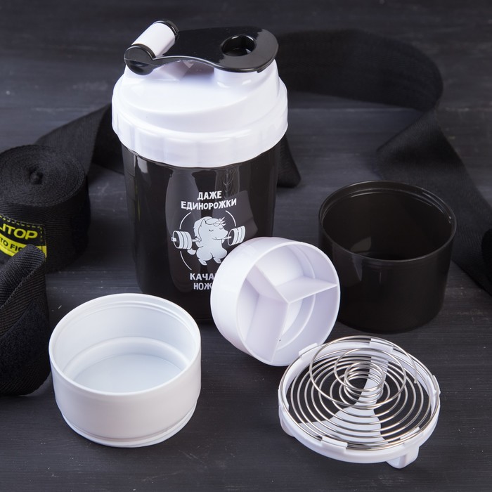 Особенностью этого шейкера является съёмная чаша для протеина, которая позволяет удобно хранить и смешивать порошковые добавки. Это делает его идеальным выбором для спортсменов и людей, следящих за своим рационом, обеспечивая простоту и быстроту подготовки шейков и смузи.