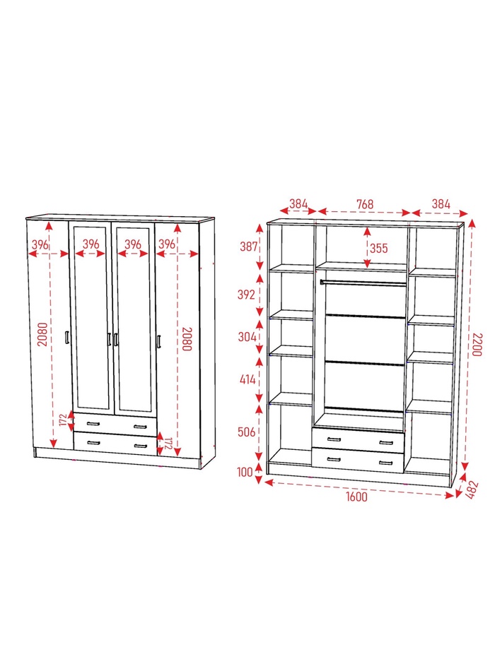 - Четыре двери: обеспечивают доступ ко всей площади шкафа, позволяя быстро находить необходимые вещи.