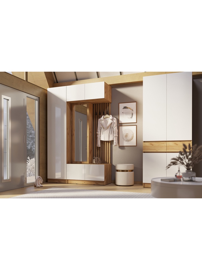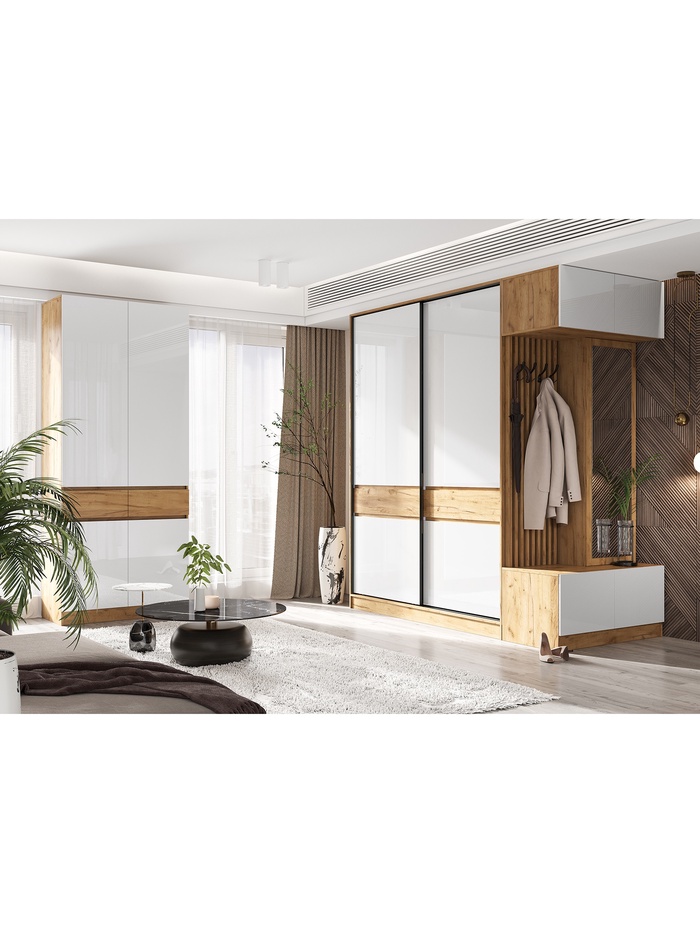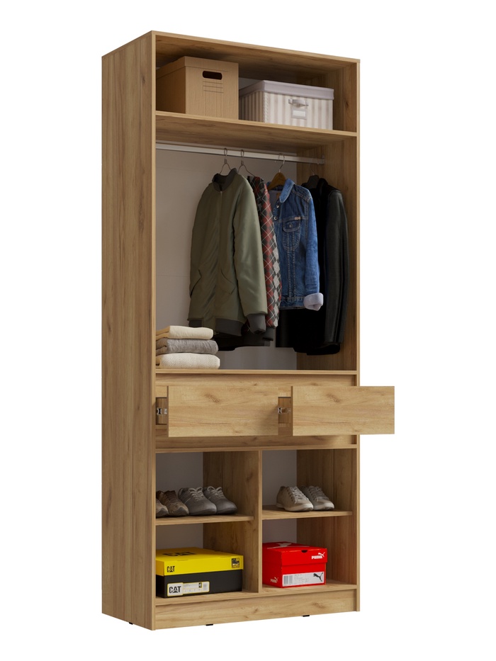 Функциональное решение для хранения одежды и аксессуаров. Продуманная конструкция сочетает штангу для верхней одежды, два вместительных выдвижных ящика и систему открытия без выступающих ручек.