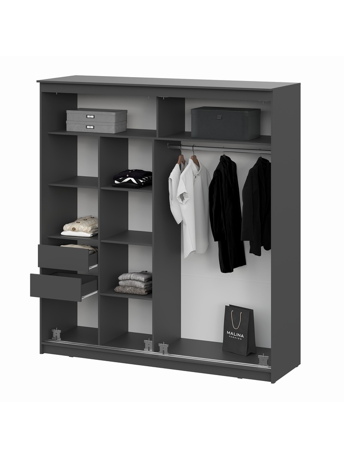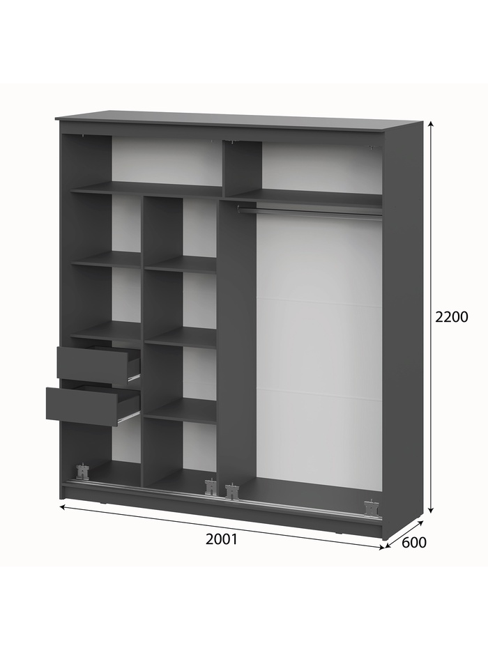 - Просторное внутреннее пространство: просторные полки, штанга для одежды и компактные ящики позволяют эффективно распределять личные вещи и поддерживать чистоту и порядок.