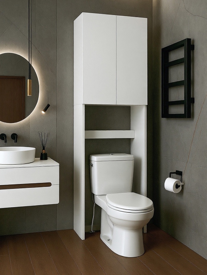 - Над унитазом: удобное размещение бумаги, полотенец, средств для уборки