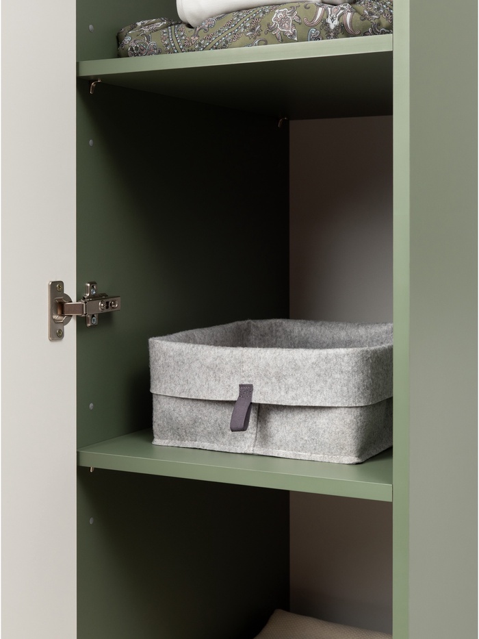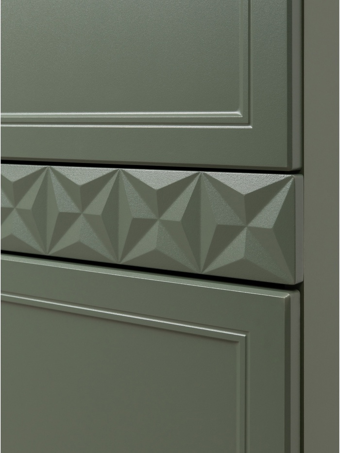 Фасады из МДФ с глубокой фрезеровкой подчёркивают классическую эстетику модели, а благородный оттенок «Олива шагрень» с глубоким зелёным тоном создаёт атмосферу уюта, тепла и респектабельности.