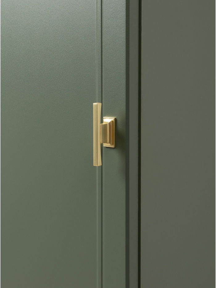 Металлические ручки и опоры с золотистым эффектом добавляют выразительности, а качественная фурнитура с доводчиками обеспечивает плавное и бесшумное закрытие дверей.