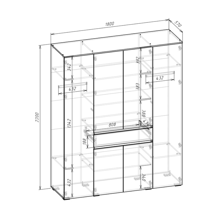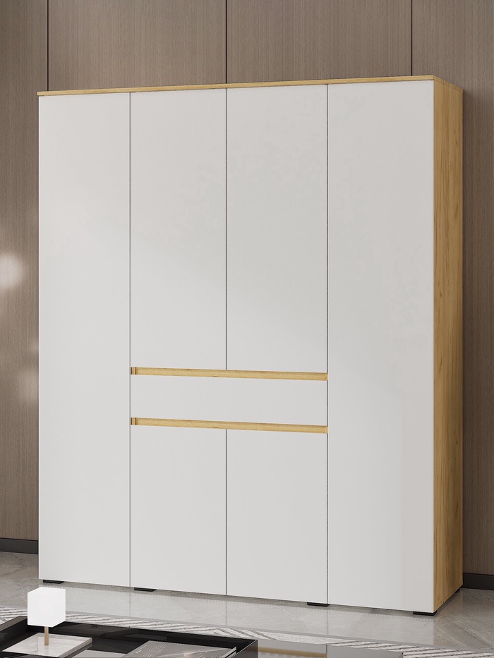 • Внутренняя комплектация: внутри предусмотрено наличие штанг для развешивания одежды и дополнительного ящика для мелких аксессуаров или белья. Полки позволяют оптимально использовать пространство шкафа, размещая вещи на разных уровнях и в разных секциях.