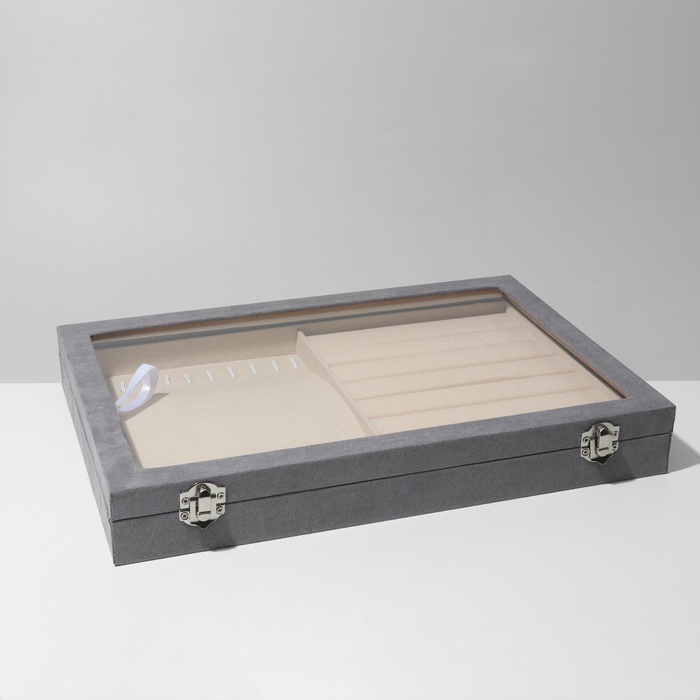 - Надёжная защита: флокированная поверхность защищает украшения от царапин и повреждений, а стеклянная крышка — от пыли.