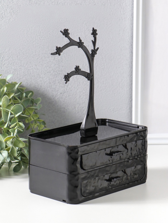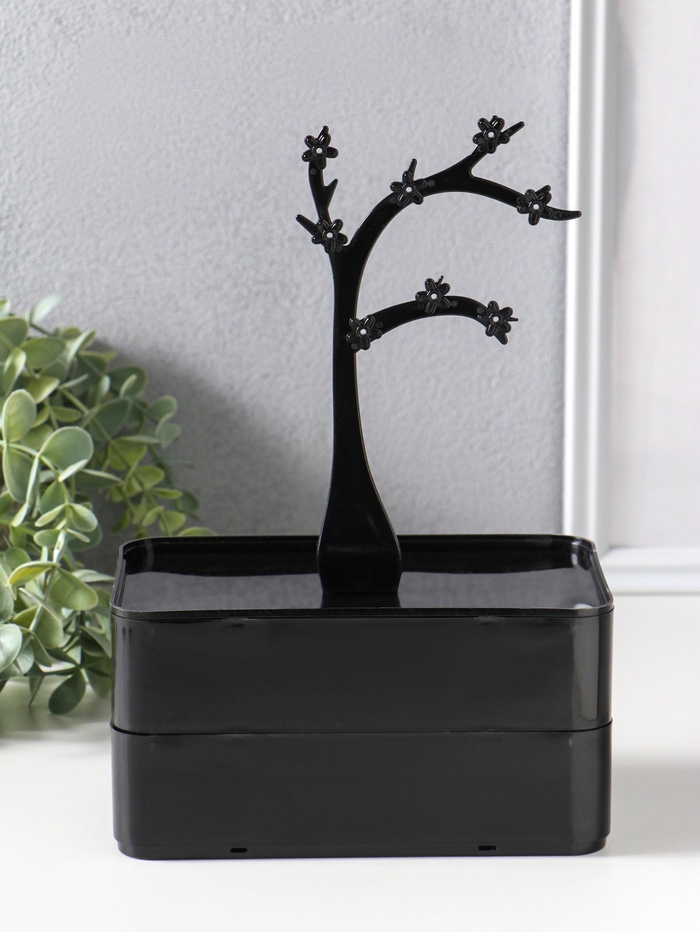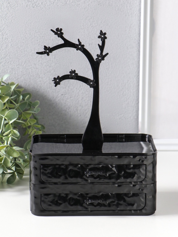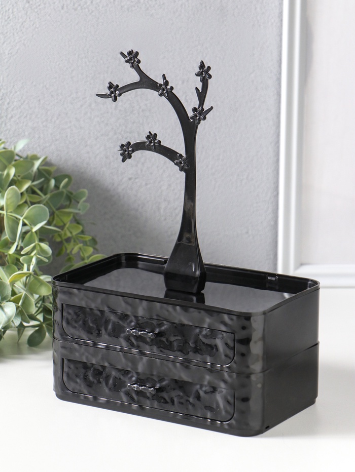 Эта двухъярусная шкатулка в виде дерева станет элегантным хранилищем для ваших драгоценностей и косметики. Её лаконичный чёрный силуэт с фигурными очертаниями органично впишется в интерьер спальни или гардеробной, предлагая практичное решение для организации мелких предметов.