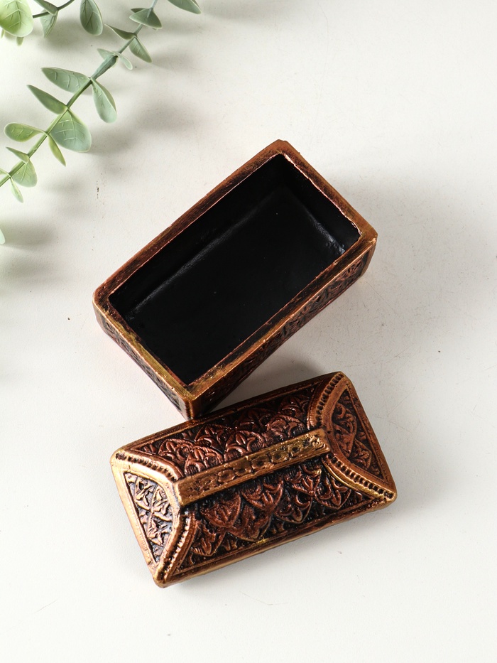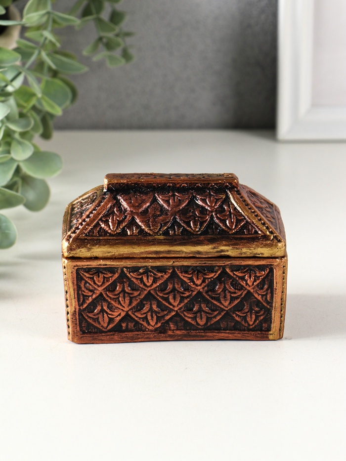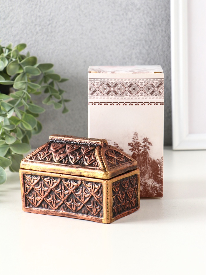 Этот ларец создан для хранения ваших самых личных сокровищ. Его компактные размеры идеально подходят для организации украшений на туалетном столике или в дорожной шкатулке. Теплый оттенок меди и рельефные узоры придают ему характер винтажной вещицы, становясь стильным акцентом в интерьере.