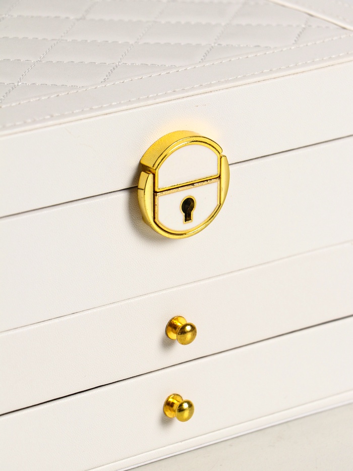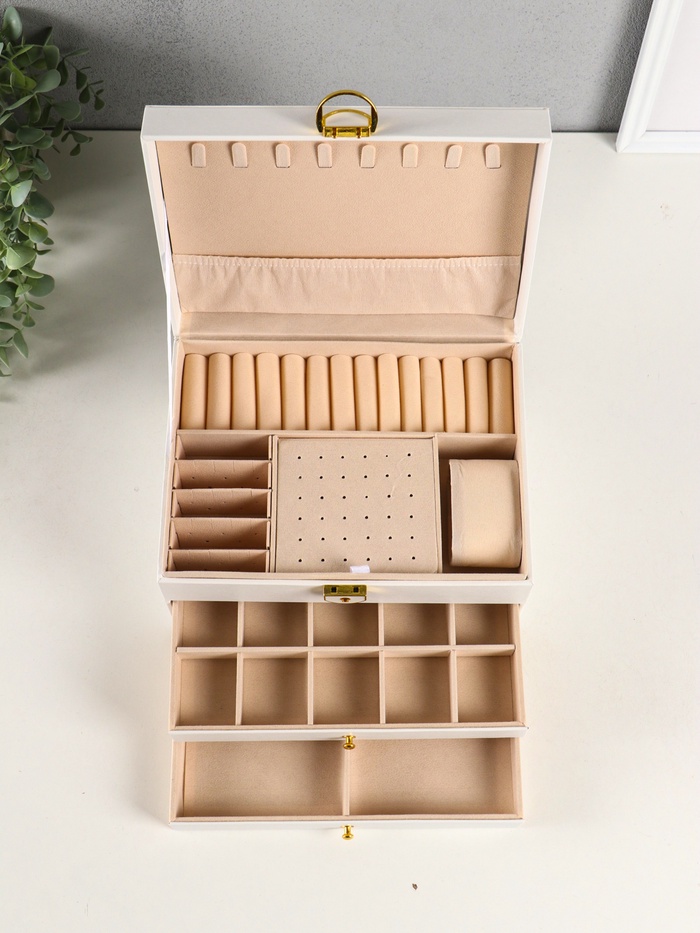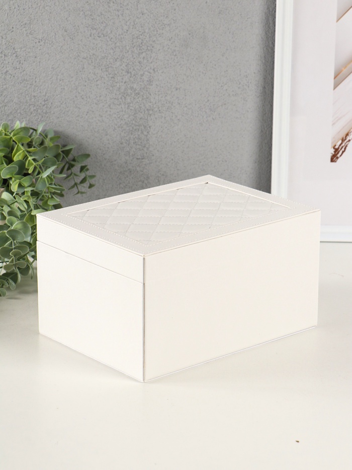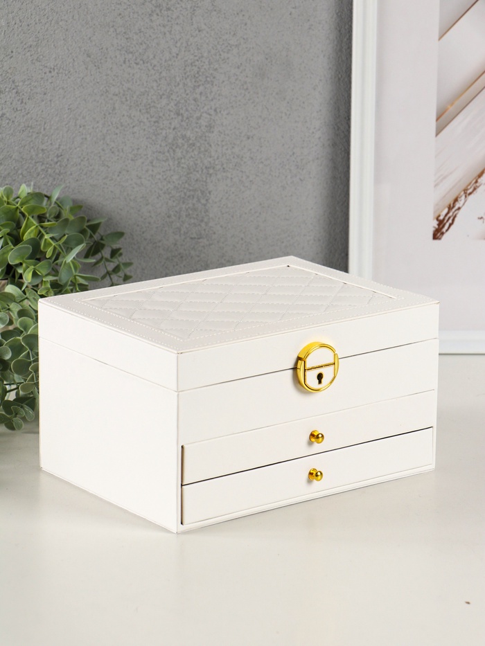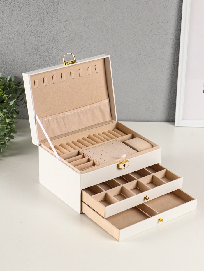 Эта белая шкатулка на три яруса — личное пространство для вашей коллекции украшений. Она создаёт идеальный порядок, где каждая вещь занимает своё место, защищая драгоценности от пыли и спутывания.