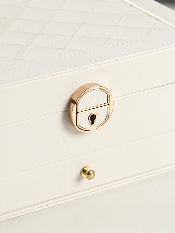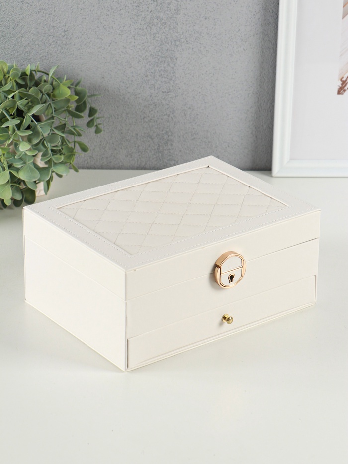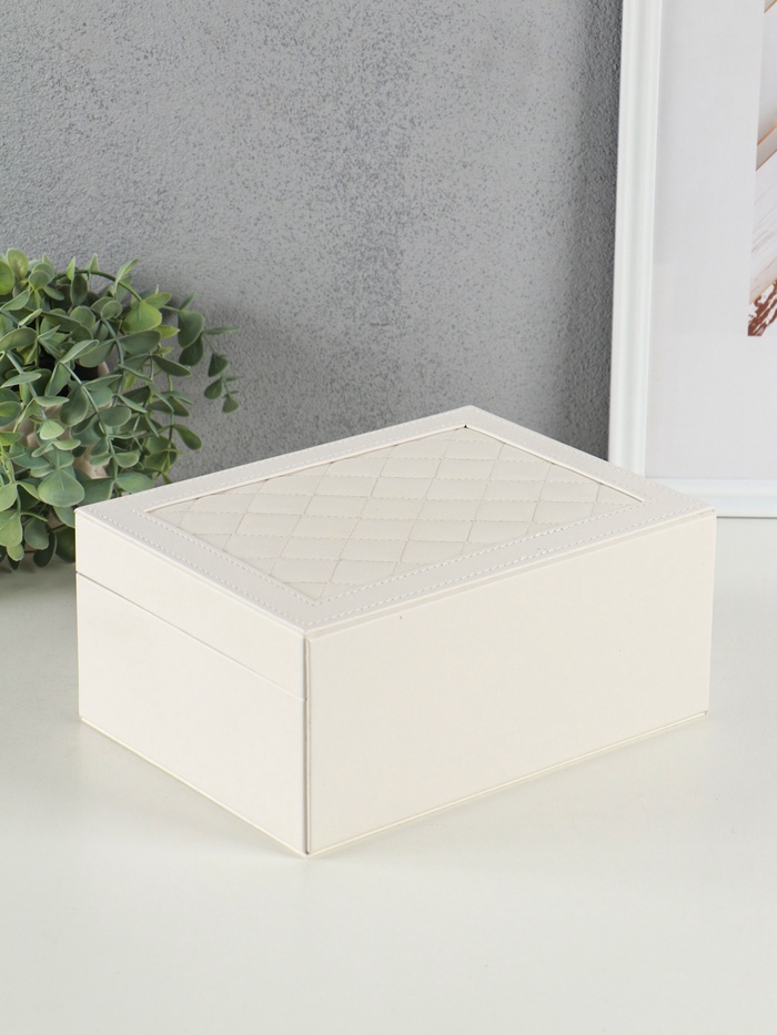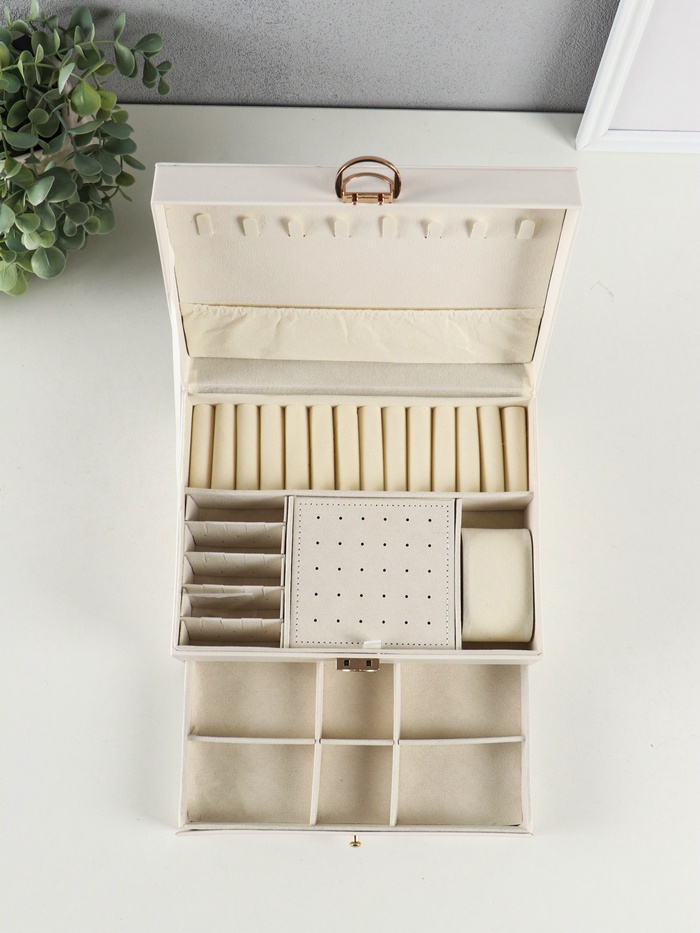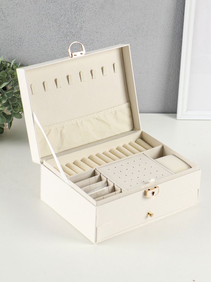 Эта двухъярусная белая шкатулка — аккуратный и продуманный дом для вашей коллекции украшений. Её компактные размеры экономят место на туалетном столике, сохраняя порядок в серьгах, кольцах и браслетах.