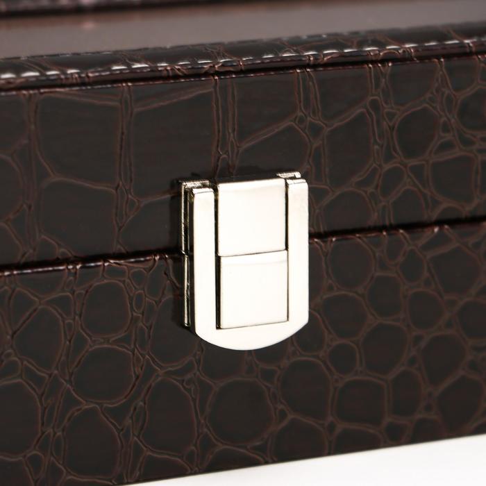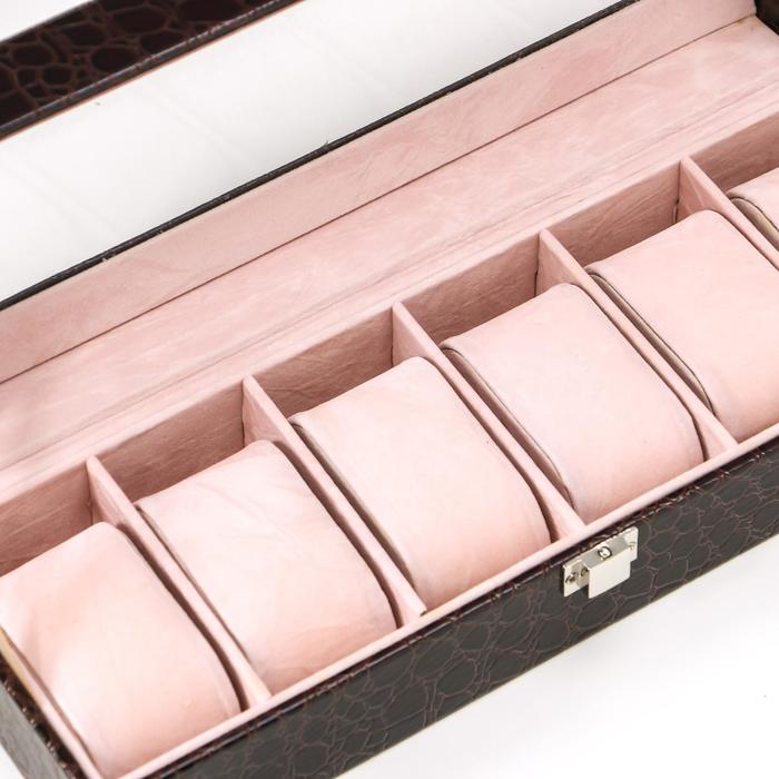Такая шкатулка – не просто стильный элемент гардеробной или туалетного столика, но и весьма полезный аксессуар: ее внутреннее пространство разделено на отделения, каждое из которых предназначено для наручных часов. Изящная и аккуратная, шкатулка изготовлена из дерева, изнутри покрыта мягким и бархатистым материалом, а снаружи – эффектной искусственной кожей.