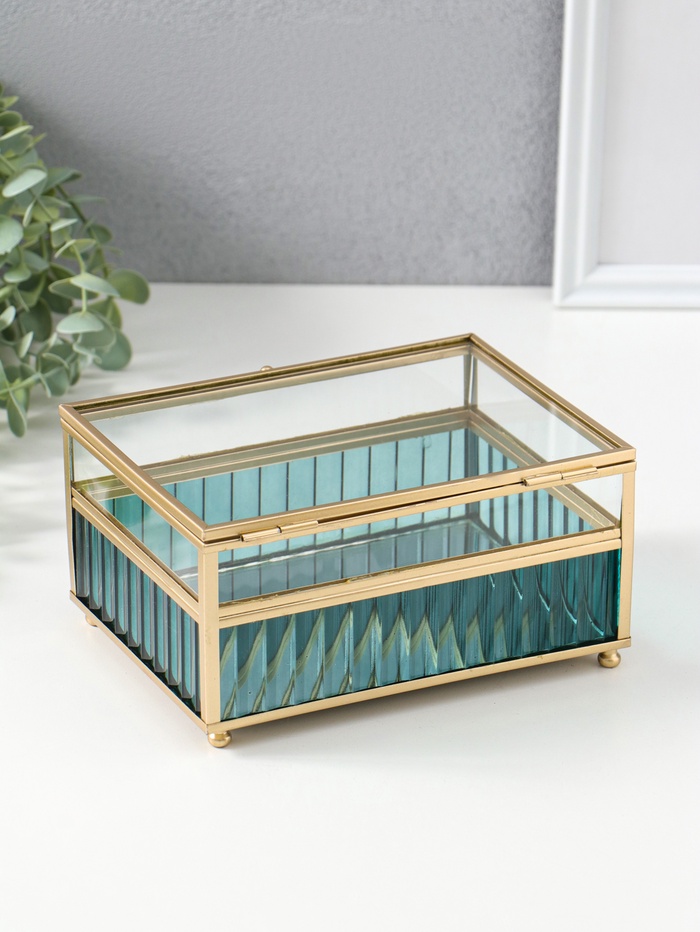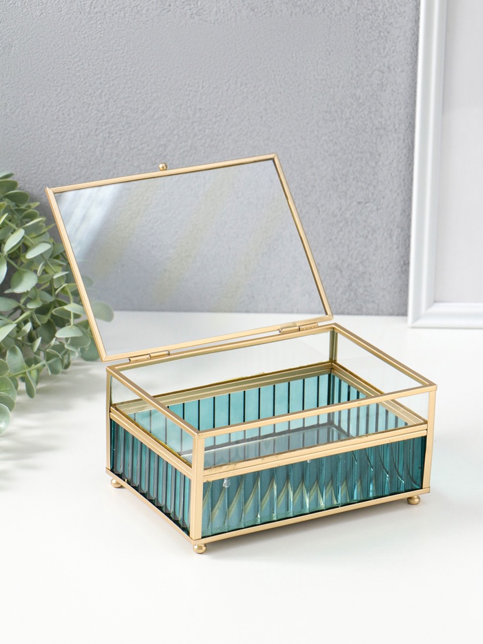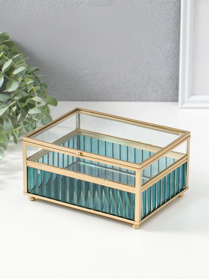 Шкатулка стекло с металлическим каркасом "Линии по низу" голубая 14х18х9,5 см