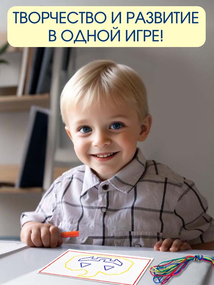 Шнуровальный планшет «Весёлые рисунки» — это развивающая игра, где ребёнок продевает цветные шнурки через отверстия, составляя узоры и фигуры. Готовые изображения получаются объёмными и яркими, а процесс игры тренирует важные навыки.