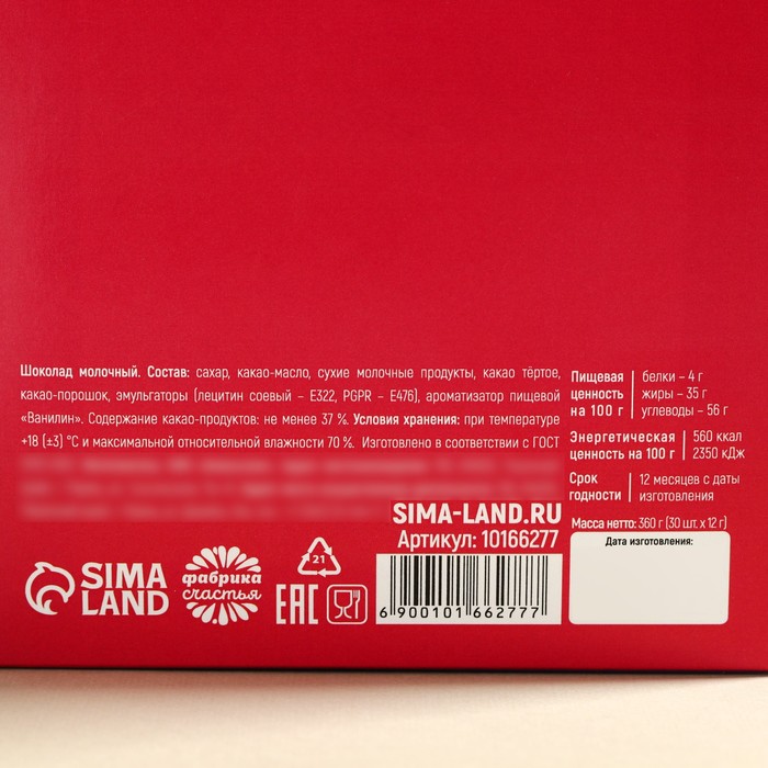 Состав: сахар, какао-масло, сухие молочные продукты, какао тёртое, какао-порошок, эмульгаторы (лецитин соевый - Е322, PGPR - Е476), ароматизатор пищевой "Ванилин".
