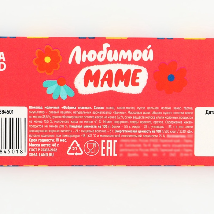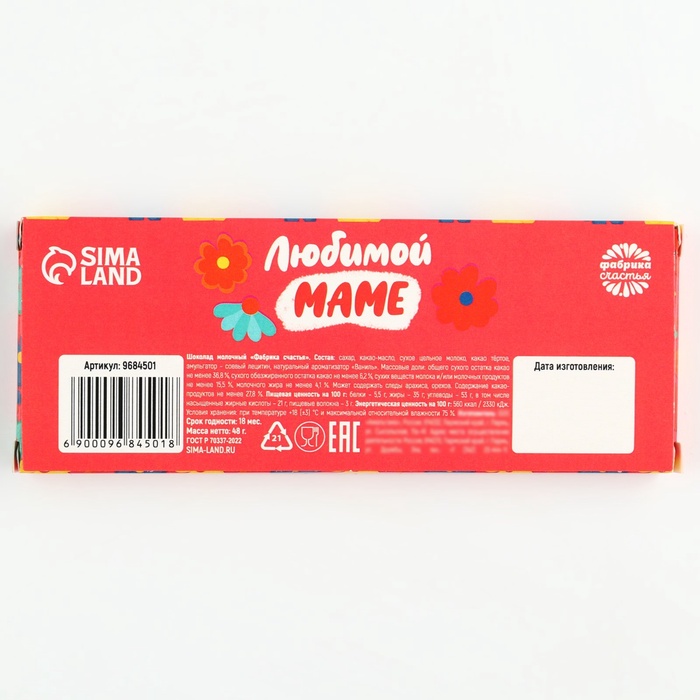 Состав: сахар, какао-масло, сухое цельное молоко, какао тёртое, эмульгатор - соевый лецитин, натуральный ароматизатор "Ванилин".