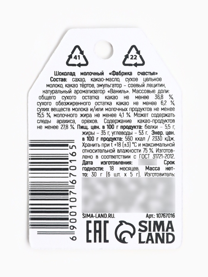 Состав: сахар, какао-масло, сухое цельное молоко, какао тёртое, эмульгатор - соевый лецитин, натуральный ароматизатор "Ваниль".