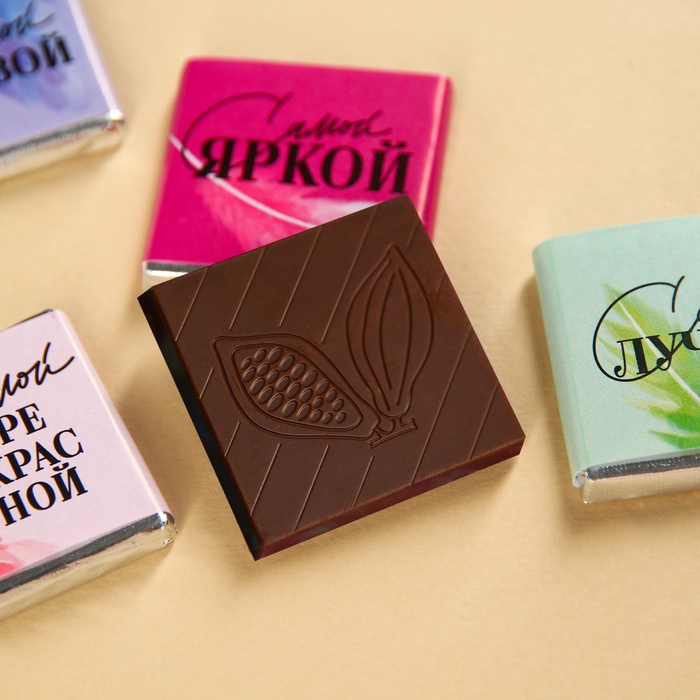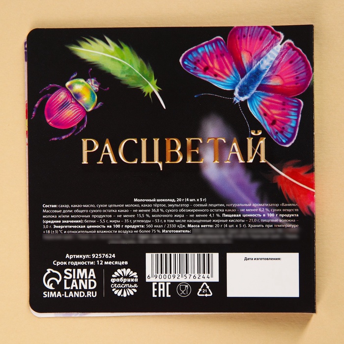 Состав: сахар, какао-масло, сухое цельное молоко, какао тёртое, эмульгатор – соевый лецитин, натуральный ароматизатор «Ваниль».