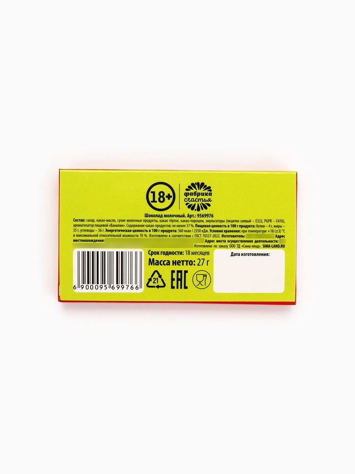 Мини-шоколад для макси-настроения! Молочный шоколад в ультраприкольной упаковке — чтобы поднять себе дух за 27 граммов счастья! Добавьте немного юмора и сладости в свою жизнь! Выбирайте свою мини-шоколадку и наслаждайтесь моментом!