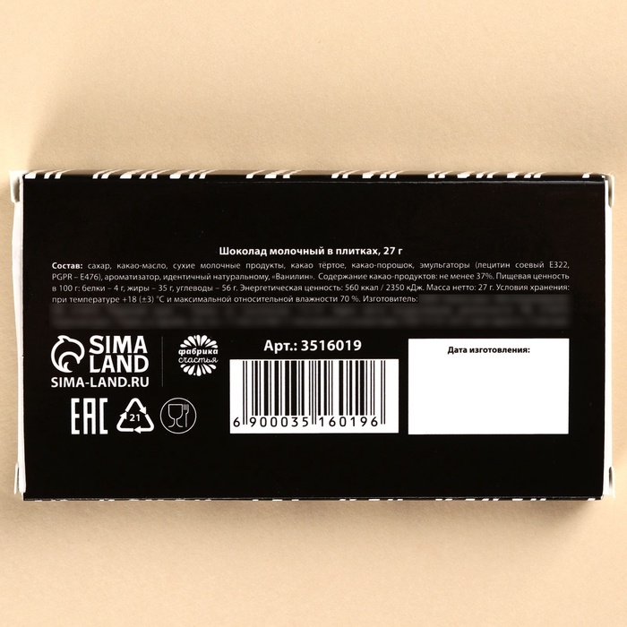 Состав: сухое цельное молоко, какое тёртое, масло какао, сухая молочная сыворотка, обезвоженный молочный жир, сахар, эмульгатор: соевый лецитин, ароматизатор, идентичный натуральному «Ванилин».