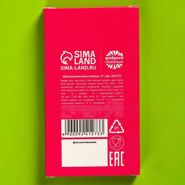 Состав: сахар, какао-масло, сухие молочные продукты, какао тёртое, какао-порошок, эмульгаторы (лецитин соевый Е322, PGPR – E476), ароматизатор, идентичный натуральному, «Ванилин».