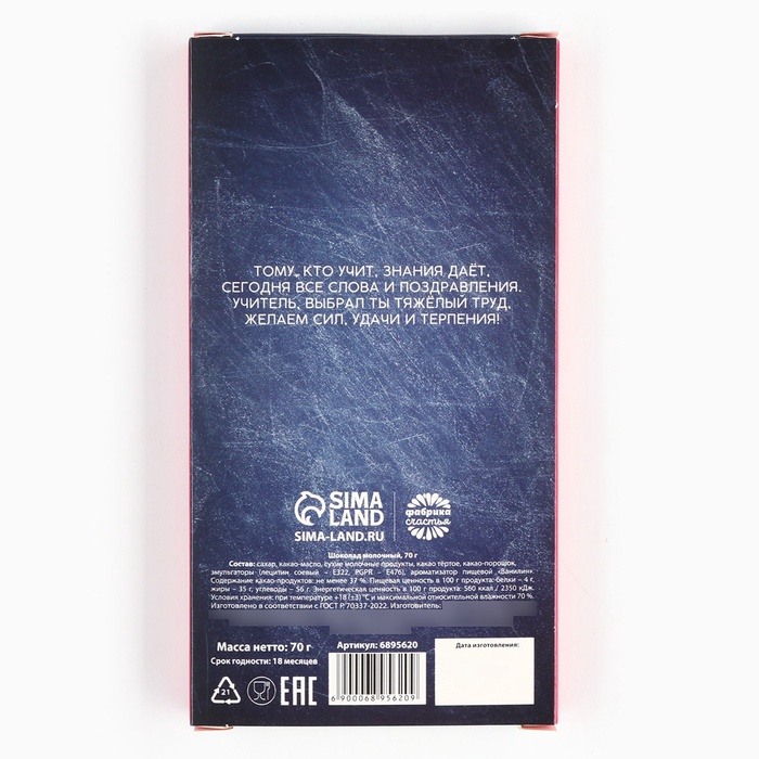 Состав: сахар, какао-масло, сухие молочные продукты, какао тертое, какао-порошок, эмульгаторы (лецитин соевый – Е322, PGPR – Е476), ароматизатор пищевой «Ванилин». Содержание какао продуктов не менее 37 %.