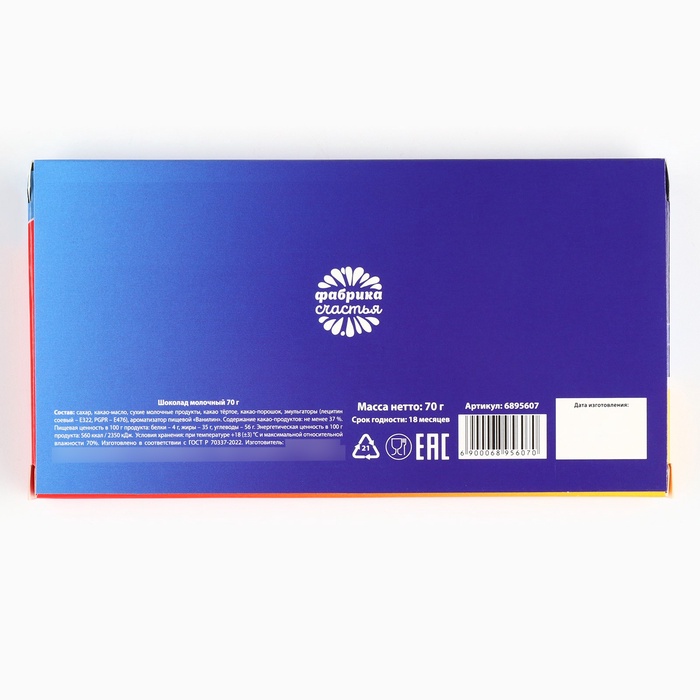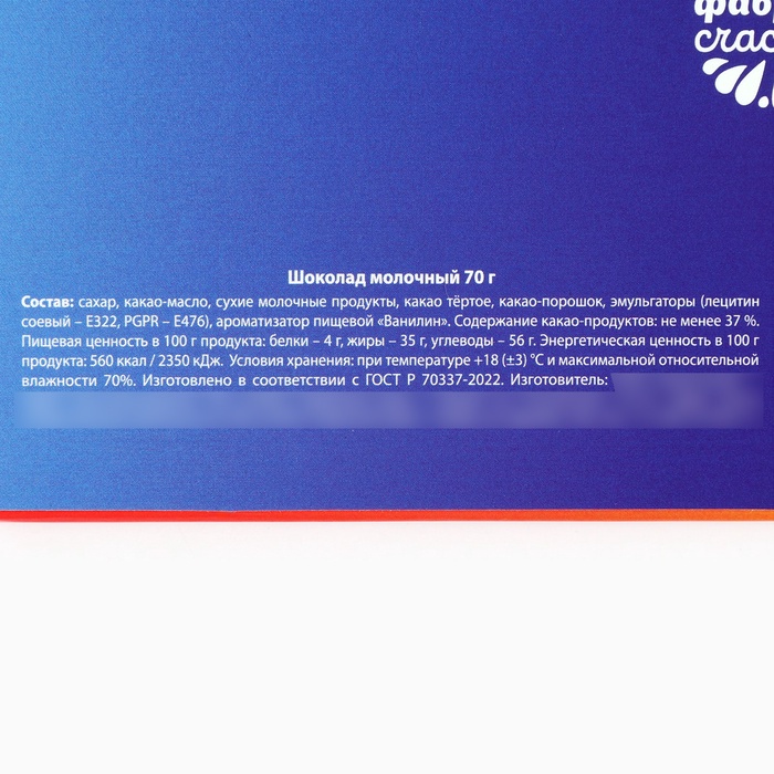 Состав: сахар, какао-масло, сухие молочные продукты, какао тертое, какао-порошок, эмульгаторы (лецитин соевый – Е322, PGPR – Е476), ароматизатор пищевой «Ванилин». Содержание какао продуктов не менее 37 %.