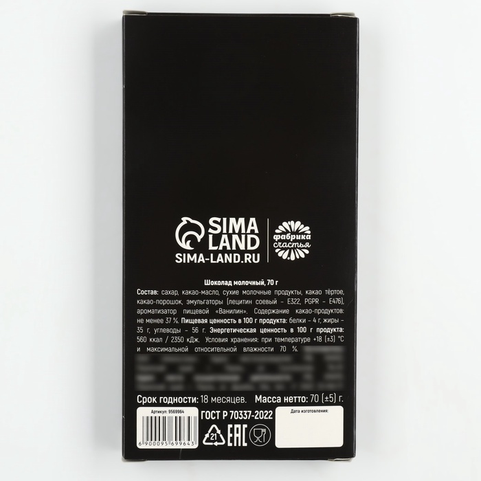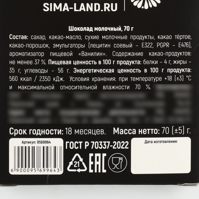 Состав: сахар, какао-масло, сухие молочные продукты, какао-тёртое, какао-порошок, эмульгаторы (лецитин соевый Е322, PGPR- E476), ароматизатор, пищевой "Ванилин".