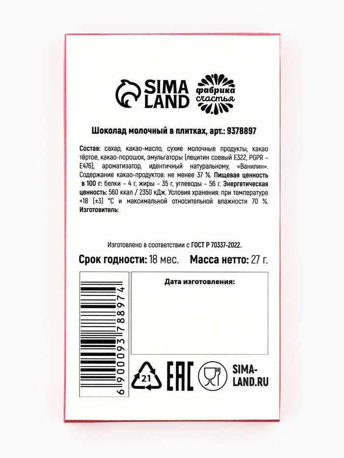 Состав: сахар, какао-масло, сухие молочные продукты, какао тёртое, какао-порошок, эмульгаторы (лецитин соевый Е322, PGPR – E476), ароматизатор, идентичный натуральному, «Ванилин».