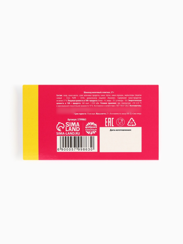 Состав: сухое цельное молоко, какое тёртое, масло какао, сухая молочная сыворотка, обезвоженный молочный жир, сахар, эмульгатор: соевый лецитин, ароматизатор, идентичный натуральному «Ванилин».