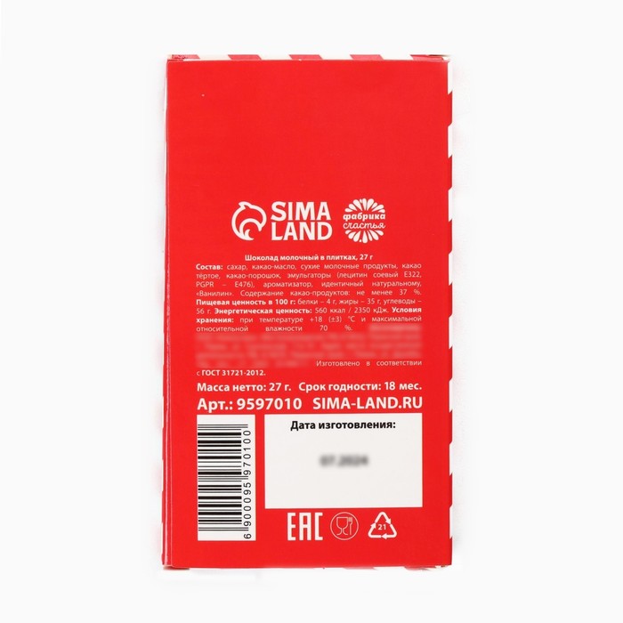 Состав: сахар, какао-масло, сухие молочные продукты, какао-порошок, эмульгаторы (лецитин соевый Е322, PGPR- E476), ароматизатор, пищевой "Ванилин".
