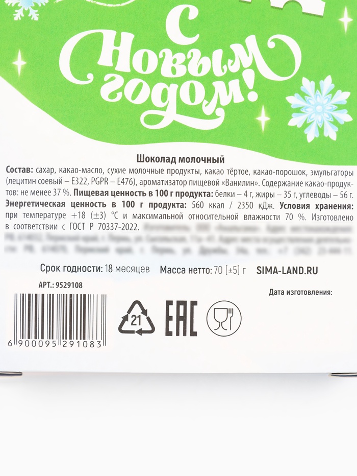 Состав: сахар, какао - масло, сухие молочные продукты, какао тёртое, какао - порошок, эмульгаторы (лецитин соевый - Е322, PGPR), ароматизатор пищевой "Ванилин". Содержание какао - продуктов: не менее 37%.