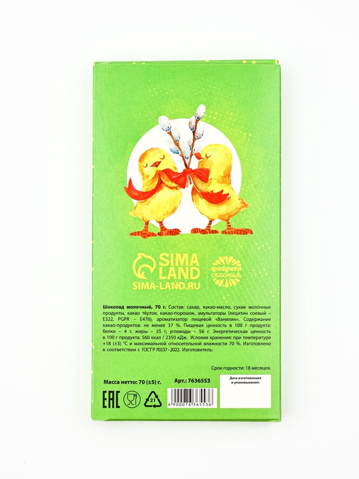 Состав: сахар, какао-масло, сухие молочные продукты, какао тертое, какао-порошок, эмульгаторы (лецитин соевый – Е322, PGPR – Е476), ароматизатор пищевой «Ванилин». Содержание какао продуктов – не менее 37 %.
