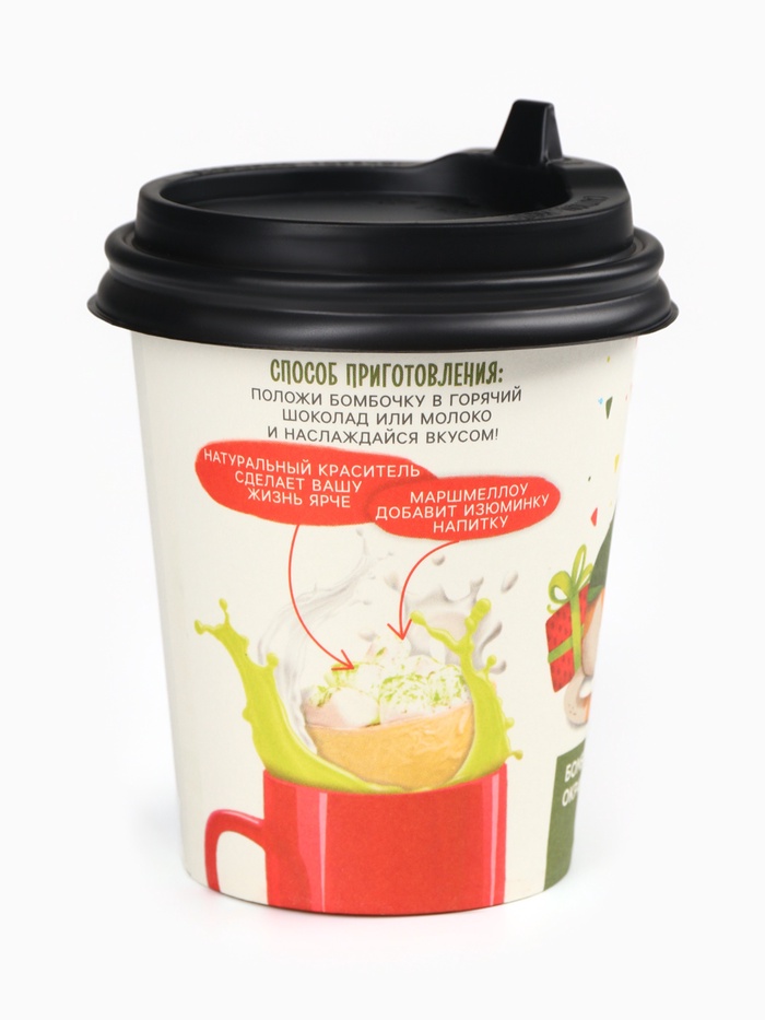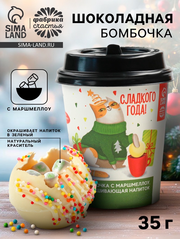 Состав: шоколад (сахар, масло какао, цельное сухое молоко, эмульгатор: соевый лецитин (Е322), ароматизатор натуральный «Ваниль», натуральные красители: куркумин, хлорофилл), маршмеллоу (сахар, патока крахмальная, глюкоза, желатин пищевой, влагоудерживающий агент – сорбитовый сироп, ароматизатор «Ванилин»), сок из побегов ячменя.