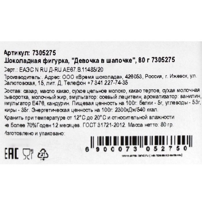 Шоколадная фигурка "Девочка в шапочке", бельгийский шоколад, 80 г