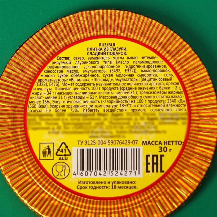 Пищевая ценность 100 г продукта (средние значения): белки - 2 г, жиры- 34 г (насыщенные жирные кислоты - менее 31 г, трансизомеры жирных кислот - менее 31 г) углеводы - 61 г. Массовая доля общего сухого остатка какао - менее 15%. Энергетическая ценность (калорийность) на 100 г продукта: 2340 кДж (560 Ккал).