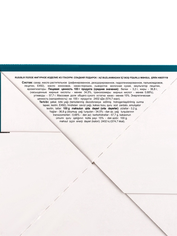 Пищевая ценность 100 г продукта (средние значения): белки - 2 г, жиры- 34 г (насыщенные жирные кислоты - менее 31 г, трансизомеры жирных кислот - менее 31 г) углеводы - 61 г. Массовая доля общего сухого остатка какао - менее 15%. Энергетическая ценность (калорийность) на 100 г продукта: 2340 кДж (560 Ккал).