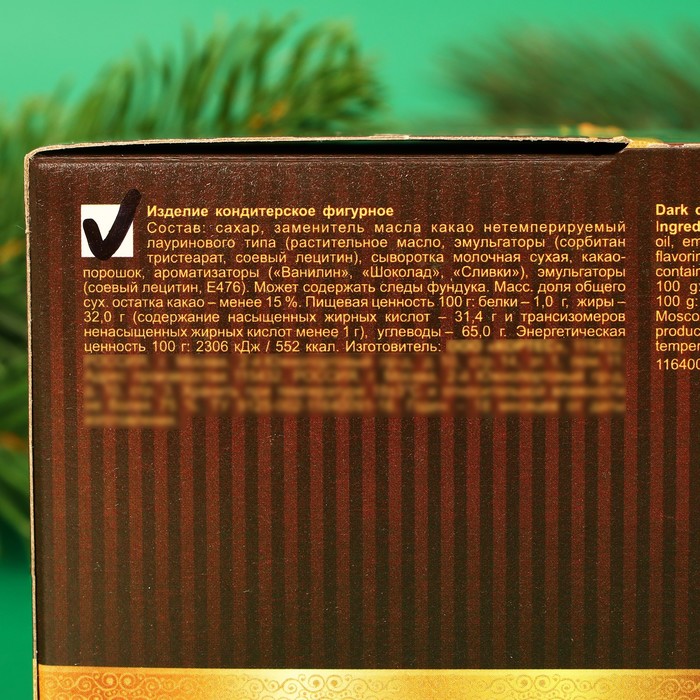 Состав: Сахар, заменитель масла какао нетемперируемый лауринового типа (растительное масло, эмульгаторы (сорбитан тристеарат, соевый лецитин), сыворотка молочная сухая, какао-порошок, ароматизаторы («Ванилин», «Шоколад», «Сливки»), эмульгаторы (соевый лецитин, Е476). Может содержать следы фундука.