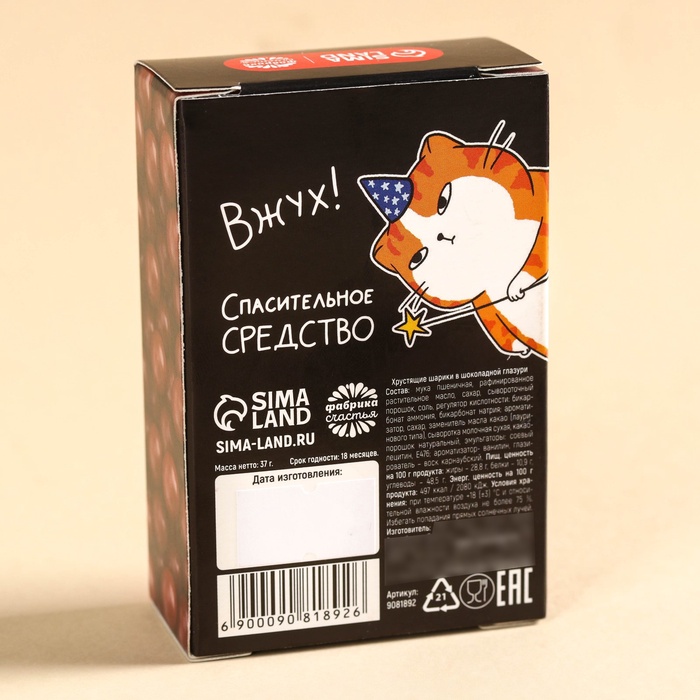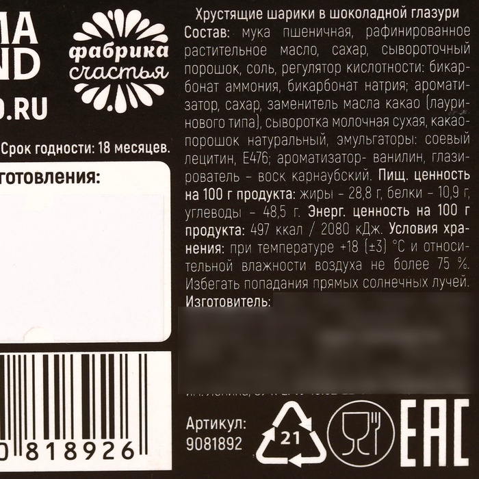 Состав: мука пшеничная, рафинированное растительное масло, сахар, сывороточный порошок, соль, регуляторы кислотности: бикарбонат аммония, бикарбонат натрия; ароматизатор, сахар, заменитель масла какао (лауринового типа), сыворотка молочная сухая, какао-порошок натуральный, эмульгаторы: соевый лецитин, Е476; ароматизатор – ванилин, глазирователь – воск карнаубский.