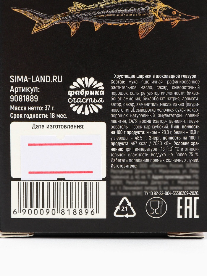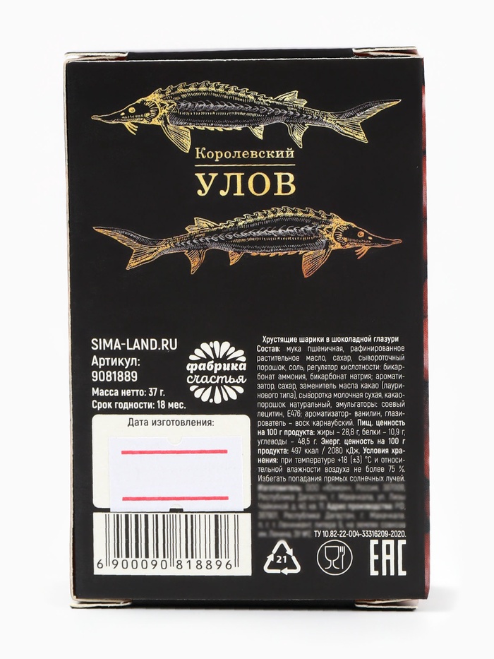 Состав: мука пшеничная, рафинированное растительное масло, сахар, сывороточный порошок, соль, регуляторы кислотности: бикарбонат аммония, бикарбонат натрия; ароматизатор, сахар, заменитель масла какао (лауринового типа), сыворотка молочная сухая, какао-порошок натуральный, эмульгаторы: соевый лецитин, Е476; ароматизатор – ванилин, глазирователь – воск карнаубский.