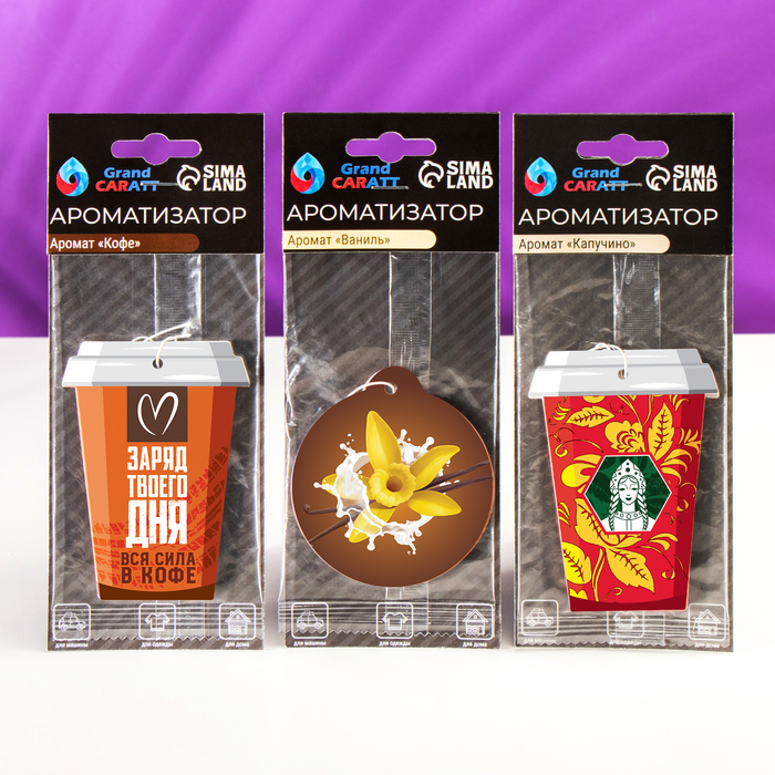В шоу-бокс Grand Caratt входят три вида подвесных ароматизаторов, подходящих для автомобиля и дома. Имеют лёгкий вес и цепляются за подвес на лобовое стекло. Можно положить в любую нишу. Специальный картон пропитан парфюмерной композицией и источает приятный аромат, который охватит окружающее пространство и будет успокаивать и одновременно помогать оставаться бдительным. А яркий дизайн ароматизатора послужит хорошим украшением для салона.