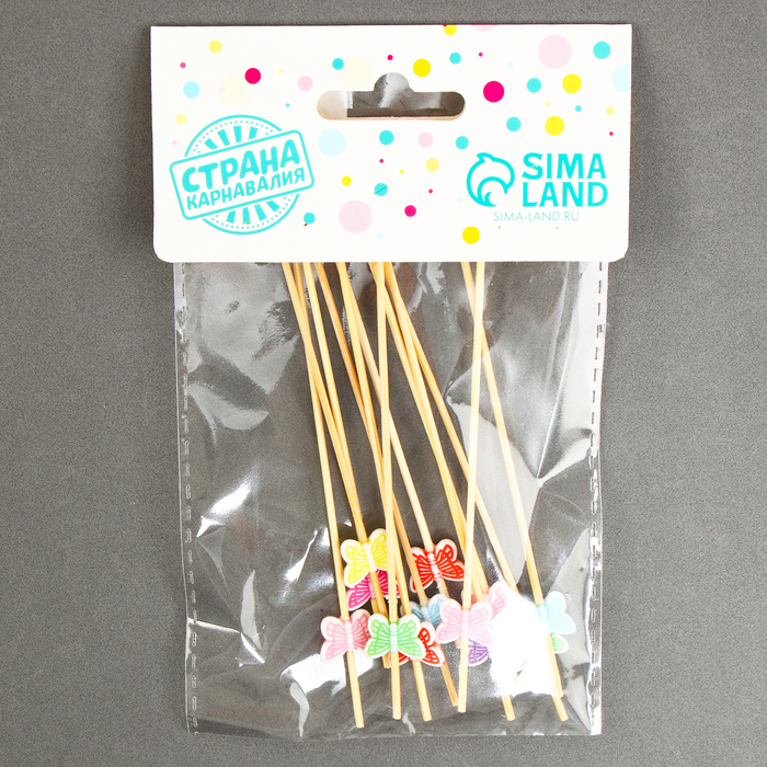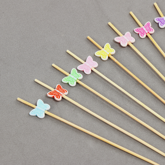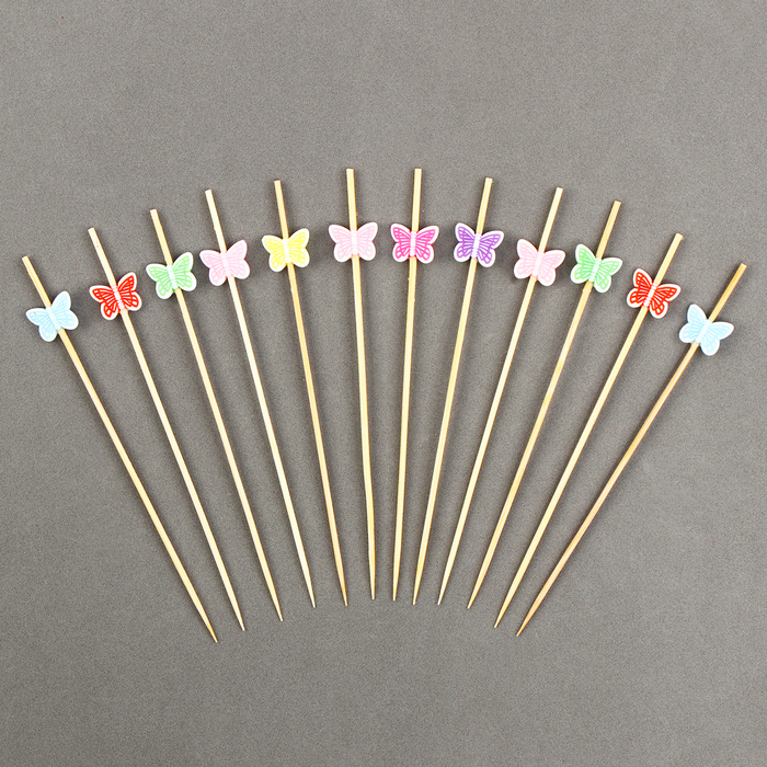 - В наборе 12 шпажек длиной 12 см, каждая выполнена из дерева с декоративным элементом в виде бабочки.