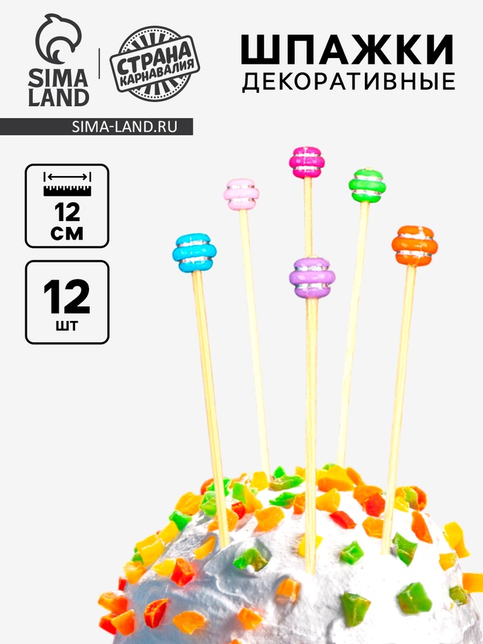 - В наборе 12 шпажек длиной 12 см, выполненных из натурального дерева с декоративными элементами в виде сладостей.