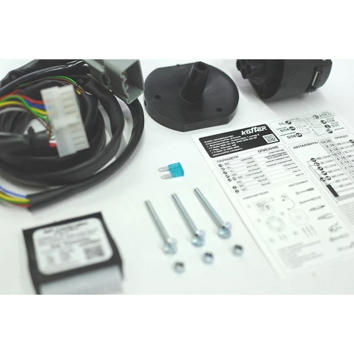 Штатная электрика ТСУ предназначена для подключения к автомобилю определенной марки, модели, годов выпуска. Электрика подключается pin-to-pin, передает сигналы задних фонарей на фонари прицепа, при этом защищая электрику автомобиля от короткого замыкания на прицепе. Комплект состоит из блока управления, жгута проводов со штатными колодками, розеткой ТСУ 7-pin, установочным комплектом.