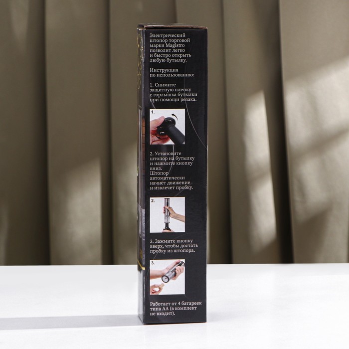 Откройте ароматное вино одним нажатием кнопки! Электрический штопор в комплекте с винным ножом, легко и быстро откроет бутылку вина. Не утруждайте себя на ручное открытие бутылок вина, попробуйте инновационный и высокотехнологичный электрический штопор.